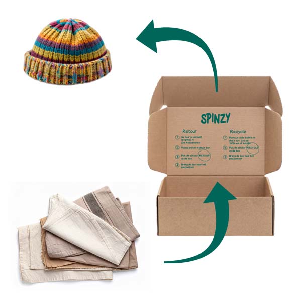 The e-commerce customers who do not need to return a product can use the SPINZY shipping box to send old cotton and wool products for recycling. There is only one standard box size and it can contain up to 5 square meters of material.